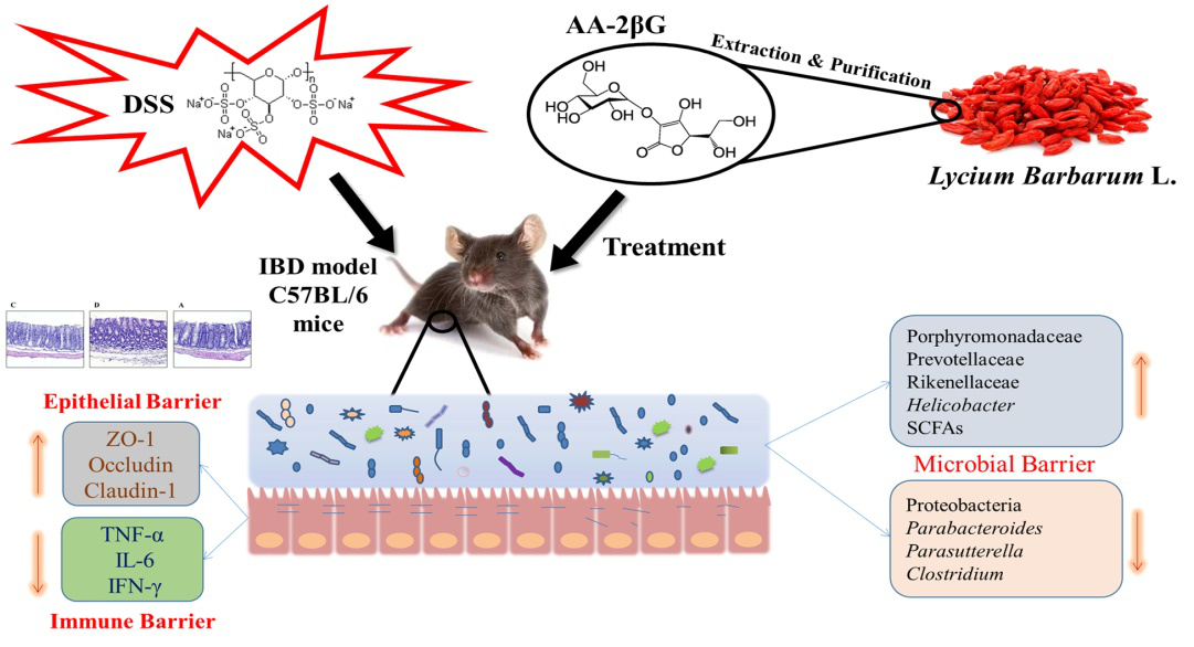 该研究表明红果枸杞中一种抗坏血酸衍生物2-O-β-D-葡萄糖基-L-抗坏血酸(AA-2βG)对葡聚糖硫酸钠(DSS)诱导的结肠炎小鼠有抗炎症活性,并对肠道菌群有一定的调节作用。该研究成果获得了匿名审稿专家的肯定,为AA-2βG的抗炎症活性提供了新的支持,同时为枸杞中活性成分AA-2βG的开发提供了科学理论依据。该研究得到了南京农业大学麻豆视频