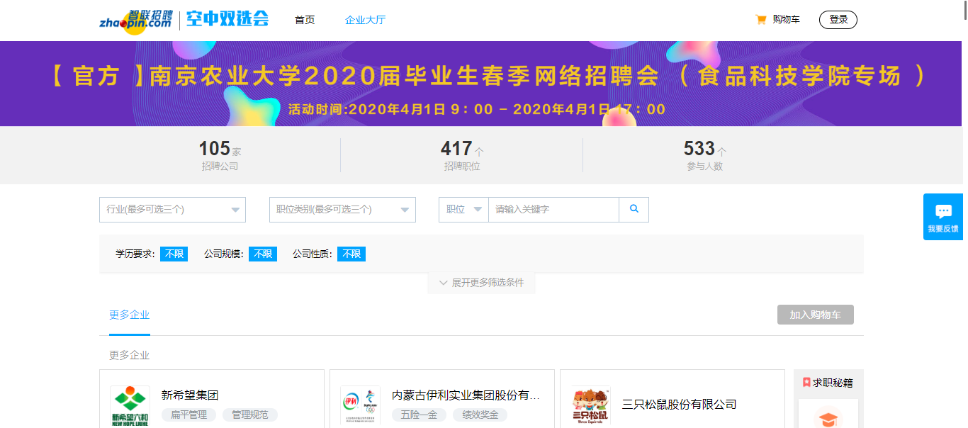 4月1日,食品院通过线上平台举办2020年毕业生春季网络招聘会。保证毕业生在疫情期间足不出户即可实现在简历投递、视频面试。