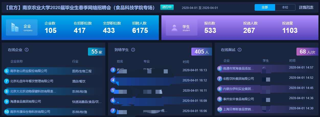 承办。本次招聘会吸引了来自全国105家企业报名参会,提供了417个招聘岗位,招聘需求人数达到6175人次。行业涵盖食品制造加工、生物技术、检测检验等多个领域。经统计,此次线上招聘会共吸引500多名毕业生参会,完成简历投递1100余份。