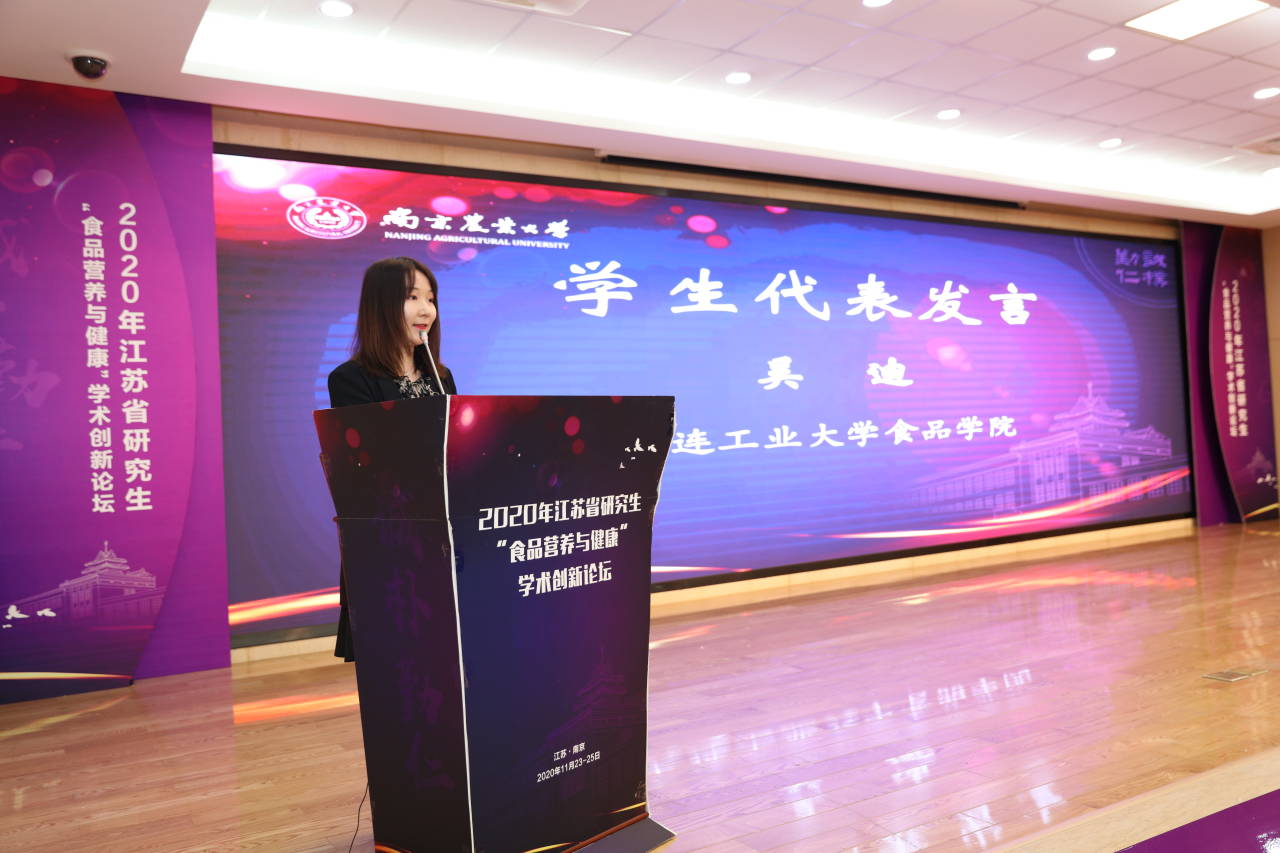 随后,南京农业大学参会学生钱婧、大连工业大学参会学生吴迪作为学生代表依次发言。她们代表全体参会研究生,将在此次论坛中交流学习、开拓眼界、提升自我、共同进步,不忘对于食品的责任、热忱和情怀,不负韶华,拥抱梦想。