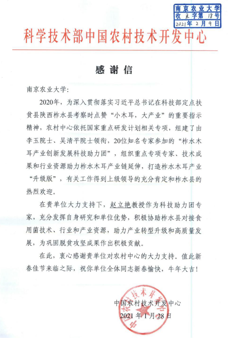近日,科技部中国农村技术开发中心为我院赵立艳教授发来感谢信。2020年,为深入贯彻落实习近平总书记在科技部定点扶贫县陕西柞水县考察时点赞“小木耳、大产业”的重要指示精神,科技部中国农村技术开发中心组建了由20位知名专家参加的“柞水木耳产业创新发展科技助力团”,有关工作得到上级领导的充分肯定和柞水县的热烈欢迎。赵立艳教授作为科技助力团专家,积极助力柞水县食用菌产业,为巩固脱贫攻坚成果作出积极贡献。