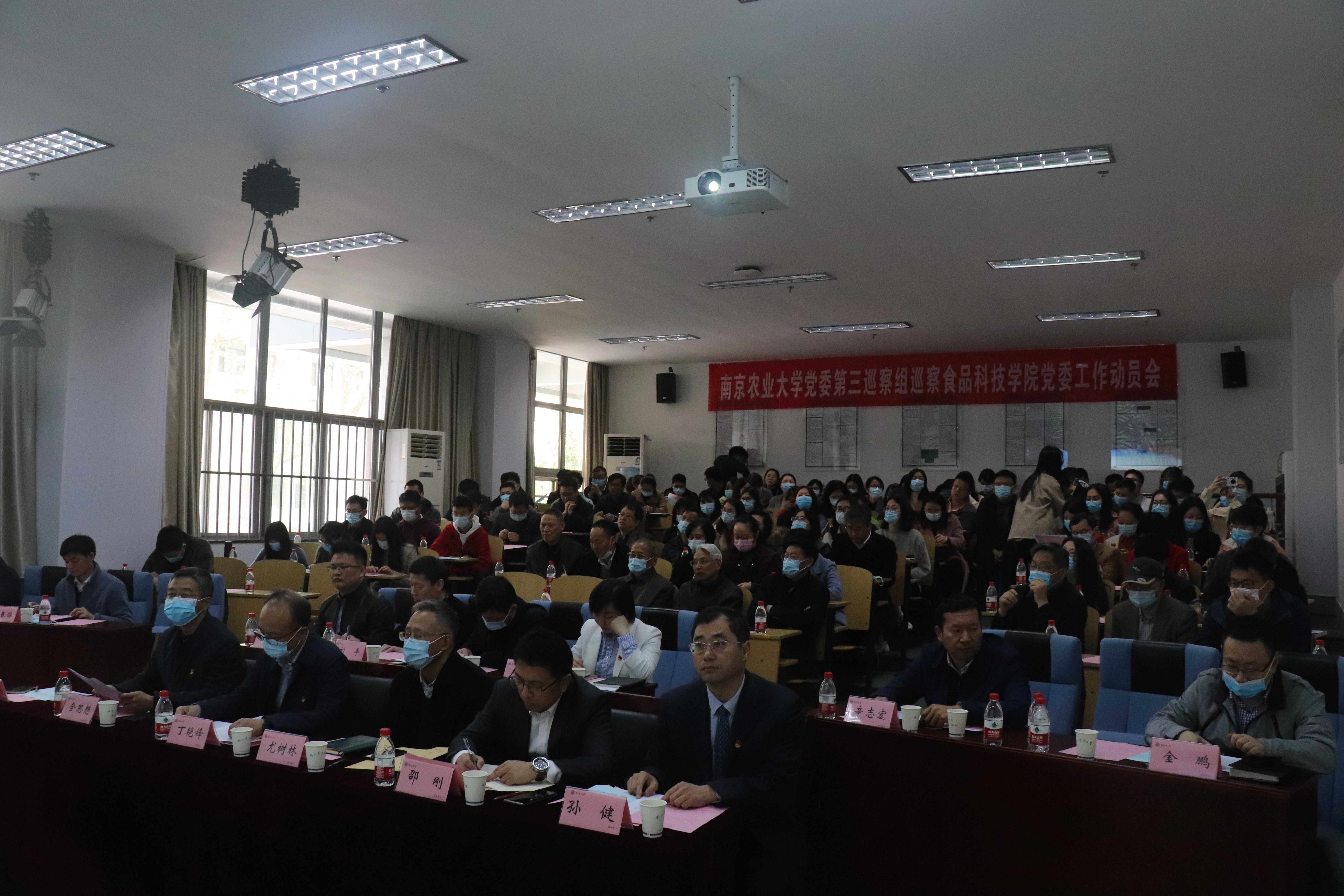46午,校党委第巡察组巡察食品科技学院党委工作动员会在国家肉品中心会议室召开。校党委常委副校长丁艳锋校党委巡察工作办公室主任尤树林,校党委第巡察组全体成员等出席会议。学院党政领导班子全体成员、近期退出领导岗位的原班子成员、党委委员、支部书记、在职教职工、退休人员代表和学生代表等参加动员会。动员会由食品学院院长徐幸莲主持。