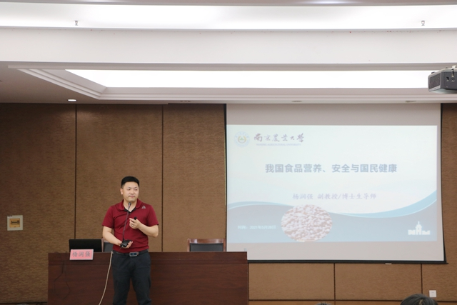 杨润强作了题为《我国食品营养、安全与国民健康》主题讲座,向同学们介绍了我国食品行业发展历程,为青年学生做好营养搭配提出了建议。同时,他还介绍了食品专业的研究领域、未来发展去向,带领同学们一起感受食品科学的魅力。