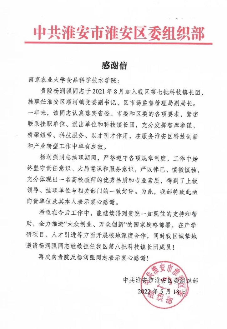 近日,中共淮安市淮安区委组织部为我院杨润强同志发来感谢信。2021年8月,杨润强同志入选江苏省淮安市第七批科技镇长团,挂职担任淮安区顺河镇党委副书记、区市场监督管理局副局长。一年来,杨润强同志深入走访全区农业和食品加工企业,为农产品加工企业提供技术指导;邀请南京农业大学、江苏省农业科学院相关专家为区农业和食品产业发展建言献策;充分发挥智库参谋、桥梁纽带、科技服务、以才引才作用,在淮上英才、省双创计划、科技项目申报中做出重要贡献。杨润强同志的表现充分体现出一名高校教师的优秀品质和专业素质,得到了上级领导、挂职单位与相关部门的一致好评。