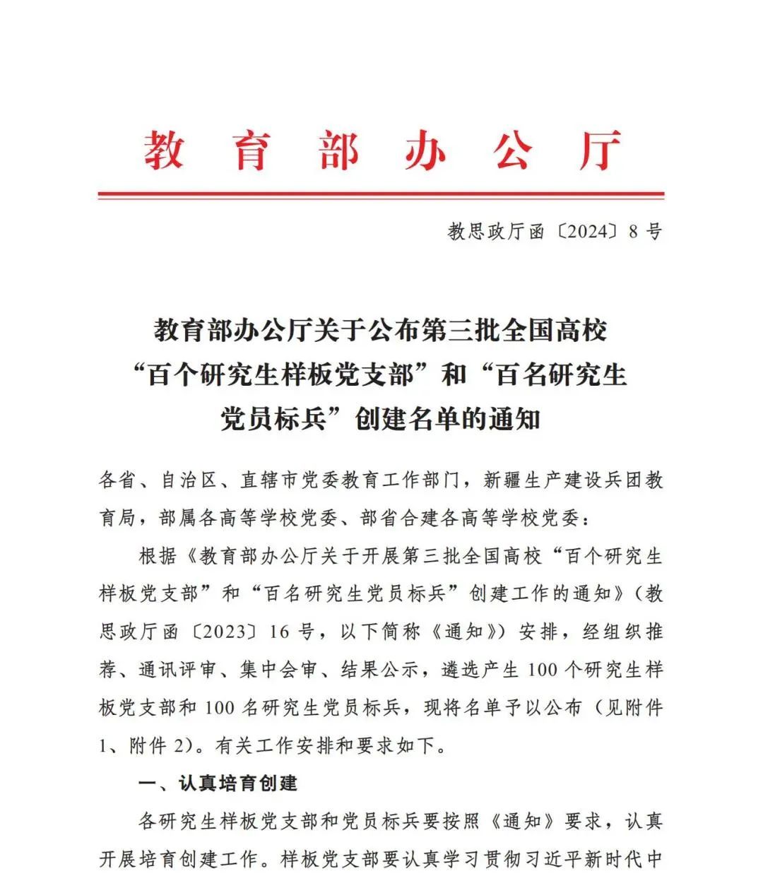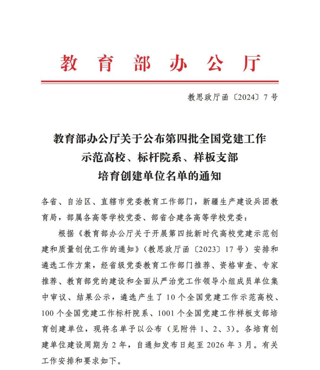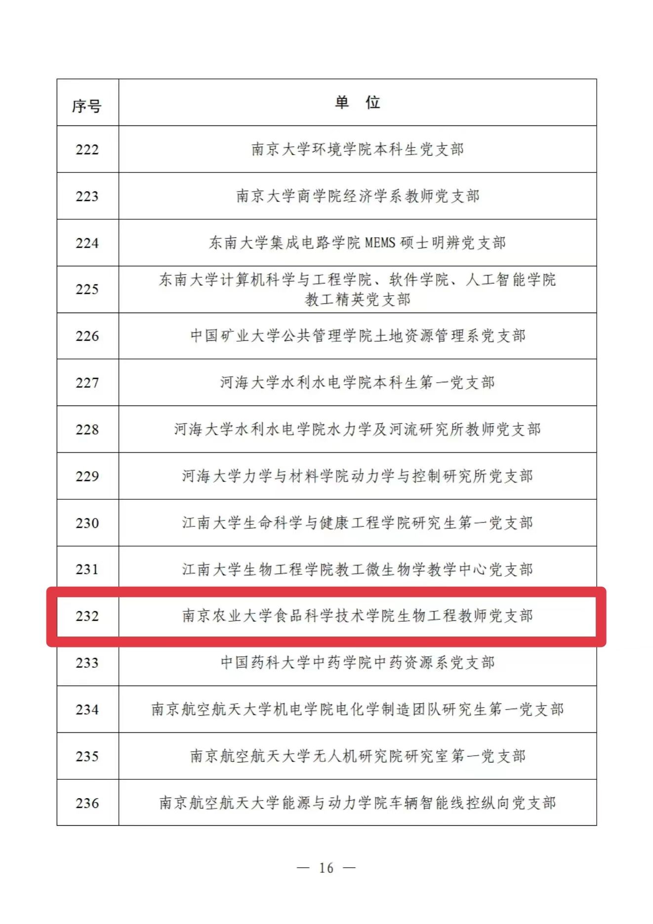 近日,教育部公布了第四批全国党建“双创”培育创建单位和第三批全国高校研究生“双百”创建名单。我院生物工程教师党支部入选第四批全国党建工作样板支部,畜产品加工硕士生第一党支部入选第三批全国高校“百个研究生样板党支部”。